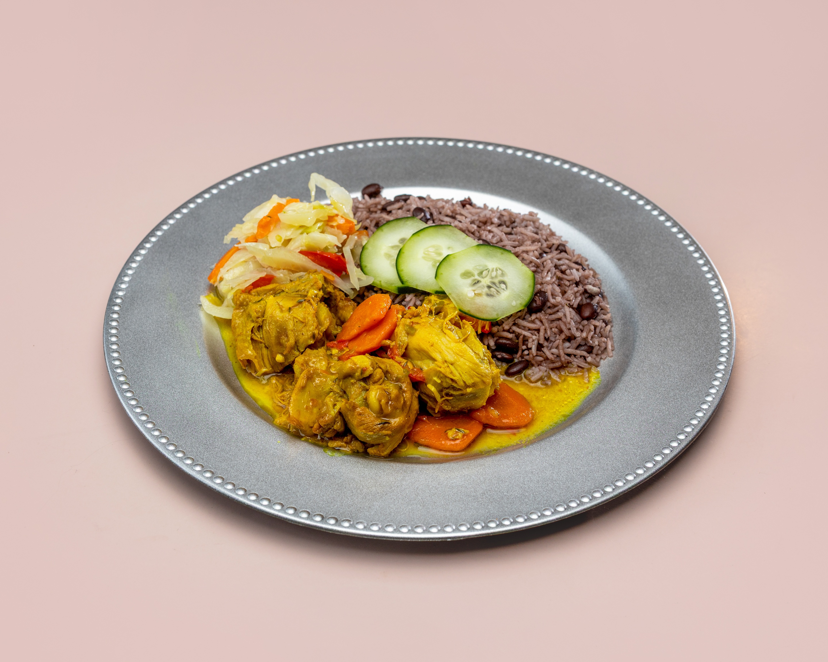 Comes with Rice & Peas and your choice of one side: Steamed Cabbage, Fried Plantains, or Pressed Plantain